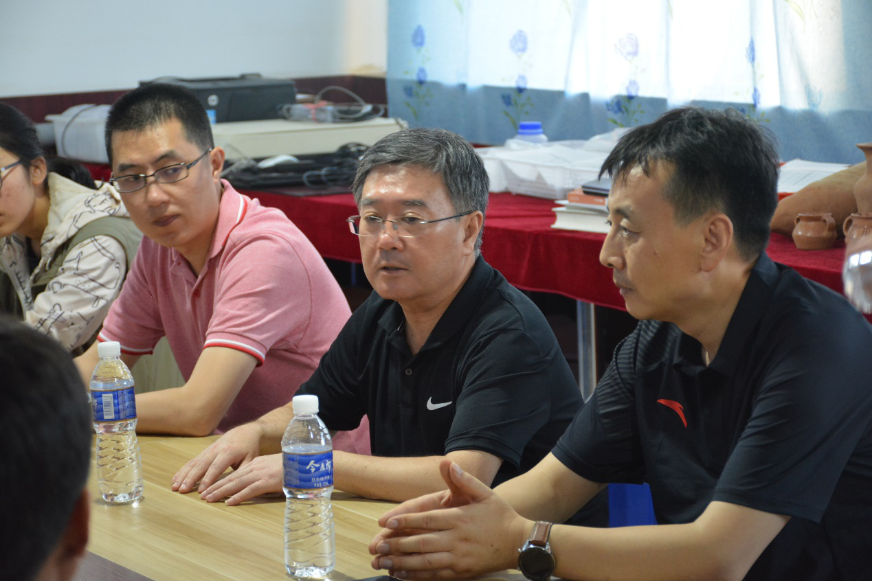 郭董事长一行逐一看望正在工地上奋战的老师和同学们,一起走进探方里、遗迹前,亲切问候大家。看到师生们顶着酷暑不辞辛劳地工作,郭董事长表示:“虽然条件艰苦,但我看到大家的精神状态非常饱满,令人振奋。希望大家不畏艰辛,继续努力,坚持到底!”。结束工地工作后,郭董事长一行与考古实习队师生们一同回到了沙塘镇考古队驻地,考察了室内资料整理、遗物修复的工作条件和师生们住宿、饮食等生活情况。