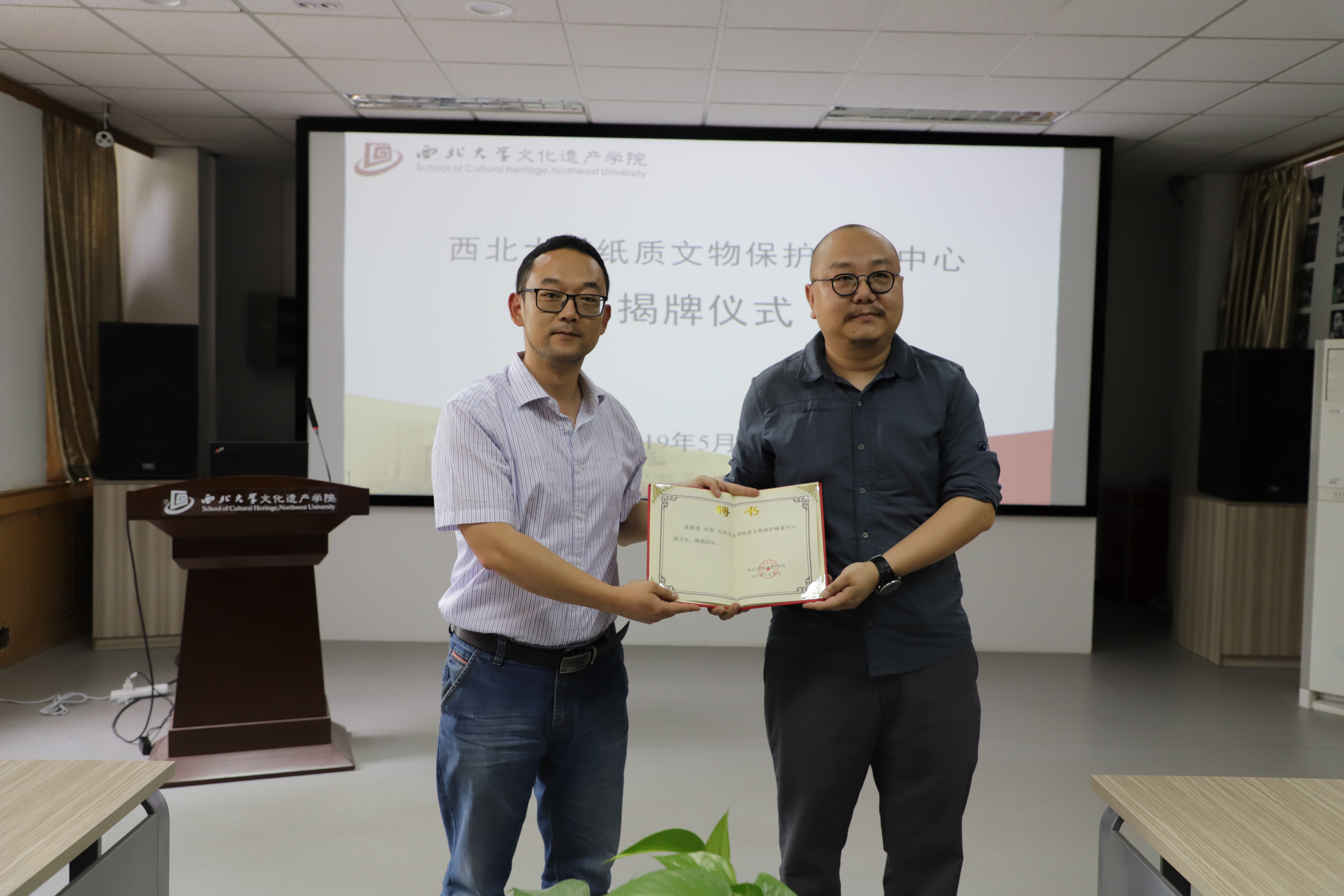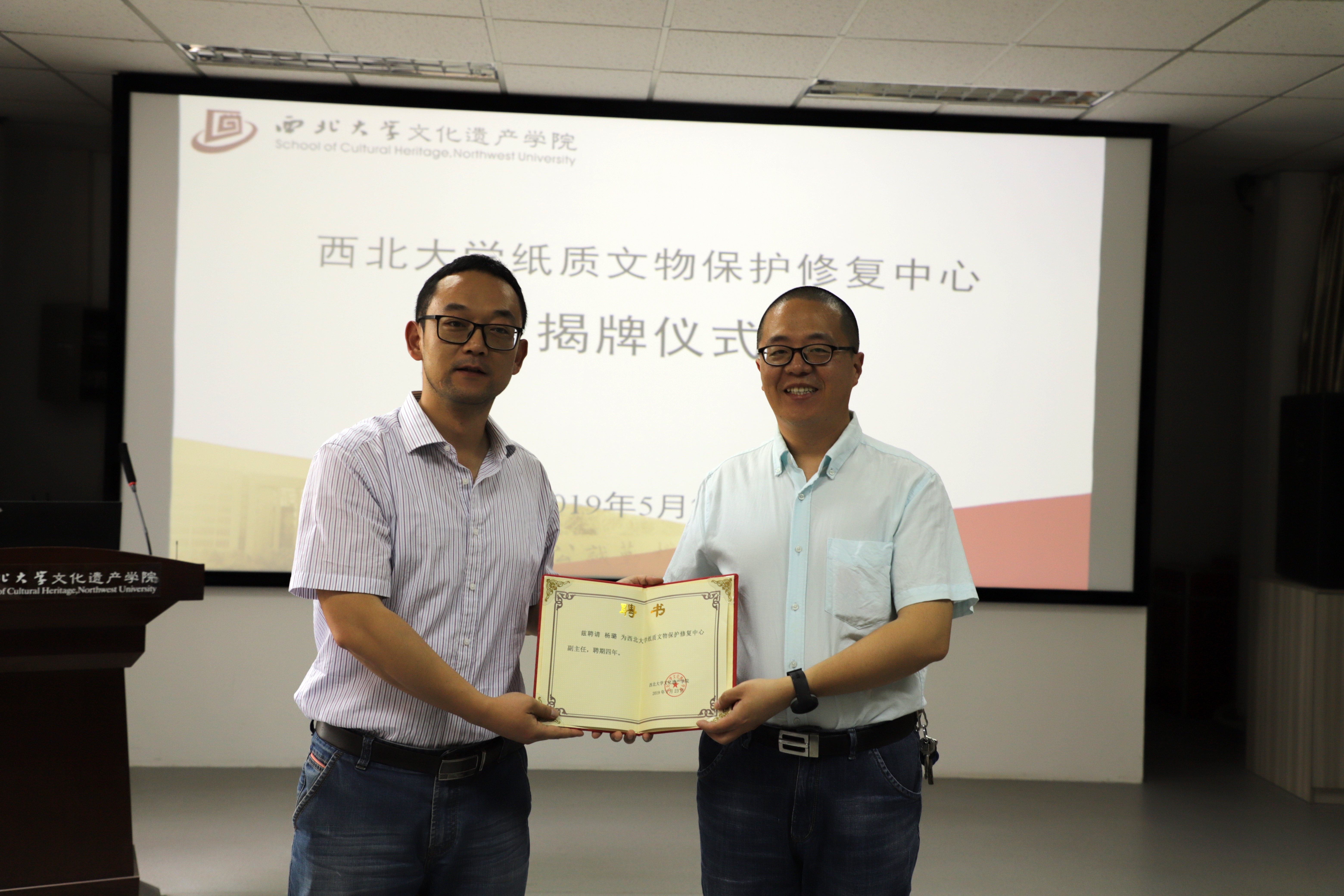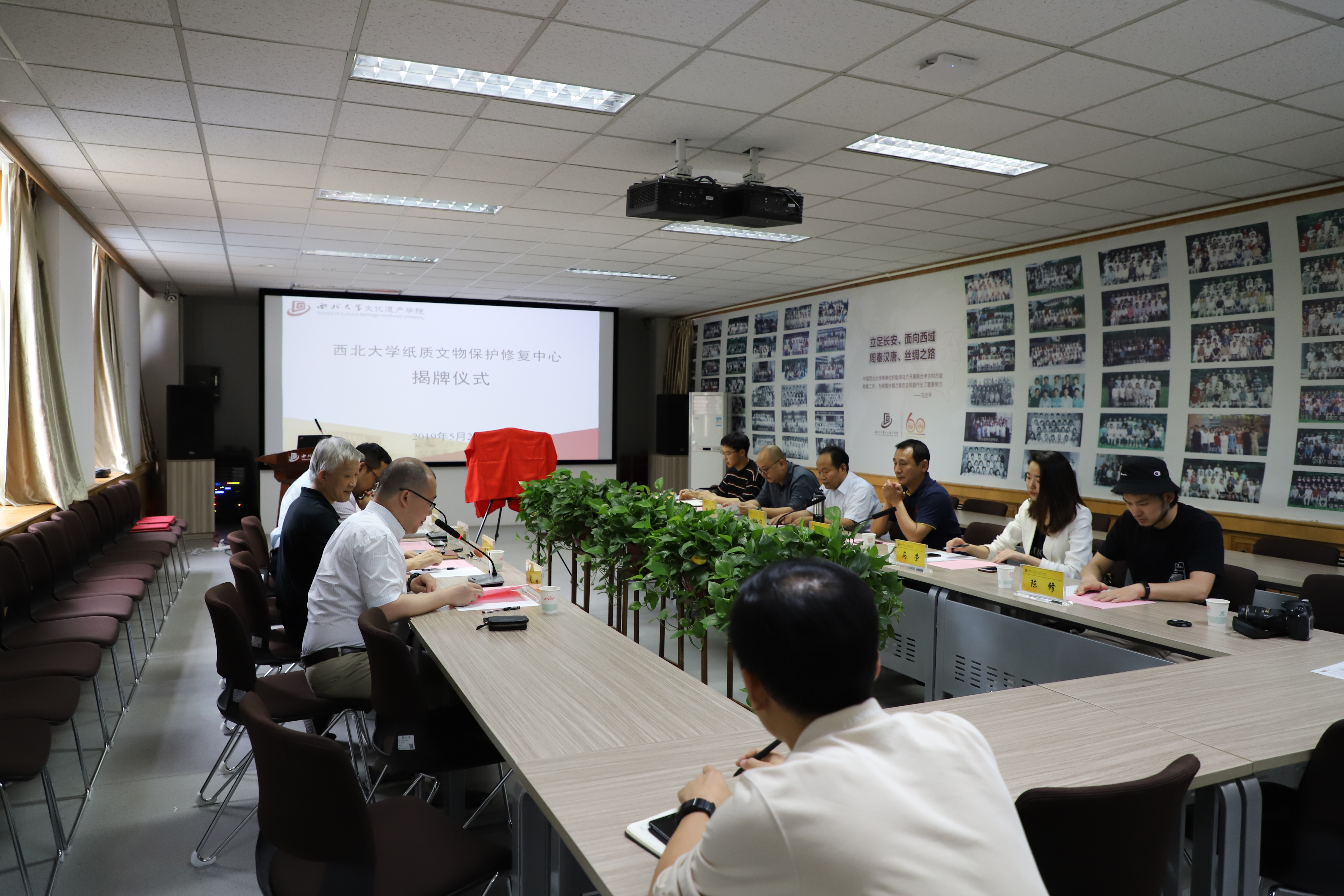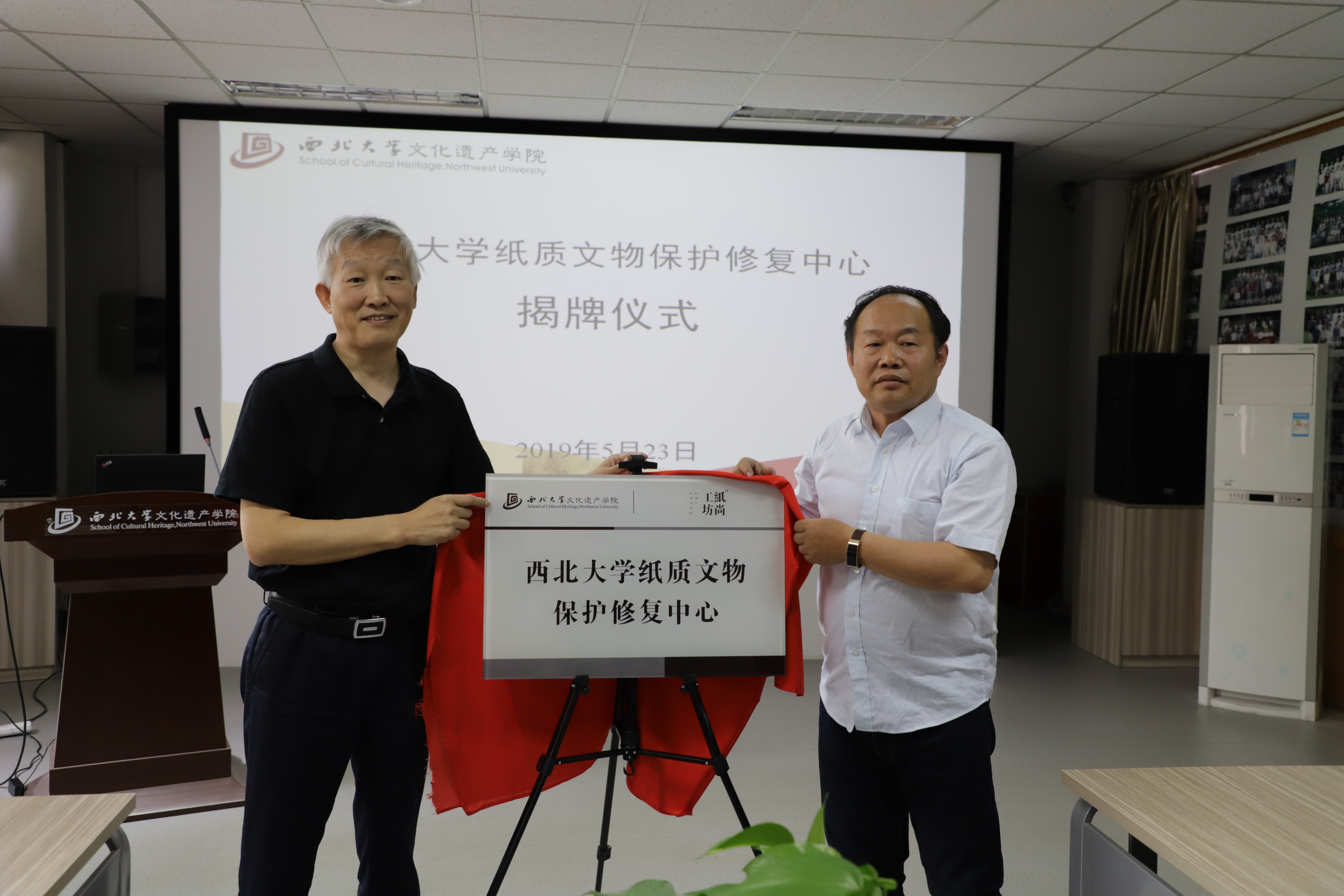 2019年5月23日下午,太阳成tyc122cc纸质文物保护修复中心成立揭牌仪式在太阳成tyc122cc太白校区太阳成tyc122cc举行,中国文物报陕西站站长庞博,西安研摩造文化发展有限公司总经理马荣,西安纸尚工坊文物保护有限责任公司技术总监尚小临,西安纸尚工坊文物保护有限责任公司总经理田朋,西安纸尚工坊文物保护有限责任公司书画组负责人陈修,西安纸尚工坊文物保护有限责任公司古籍组负责人黎鹏国,太阳成tyc122cc经理段清波,副经理马健,副经理凤鸣,文物保护技术系系主任杨璐副出席了仪式,凤鸣主持了仪式。