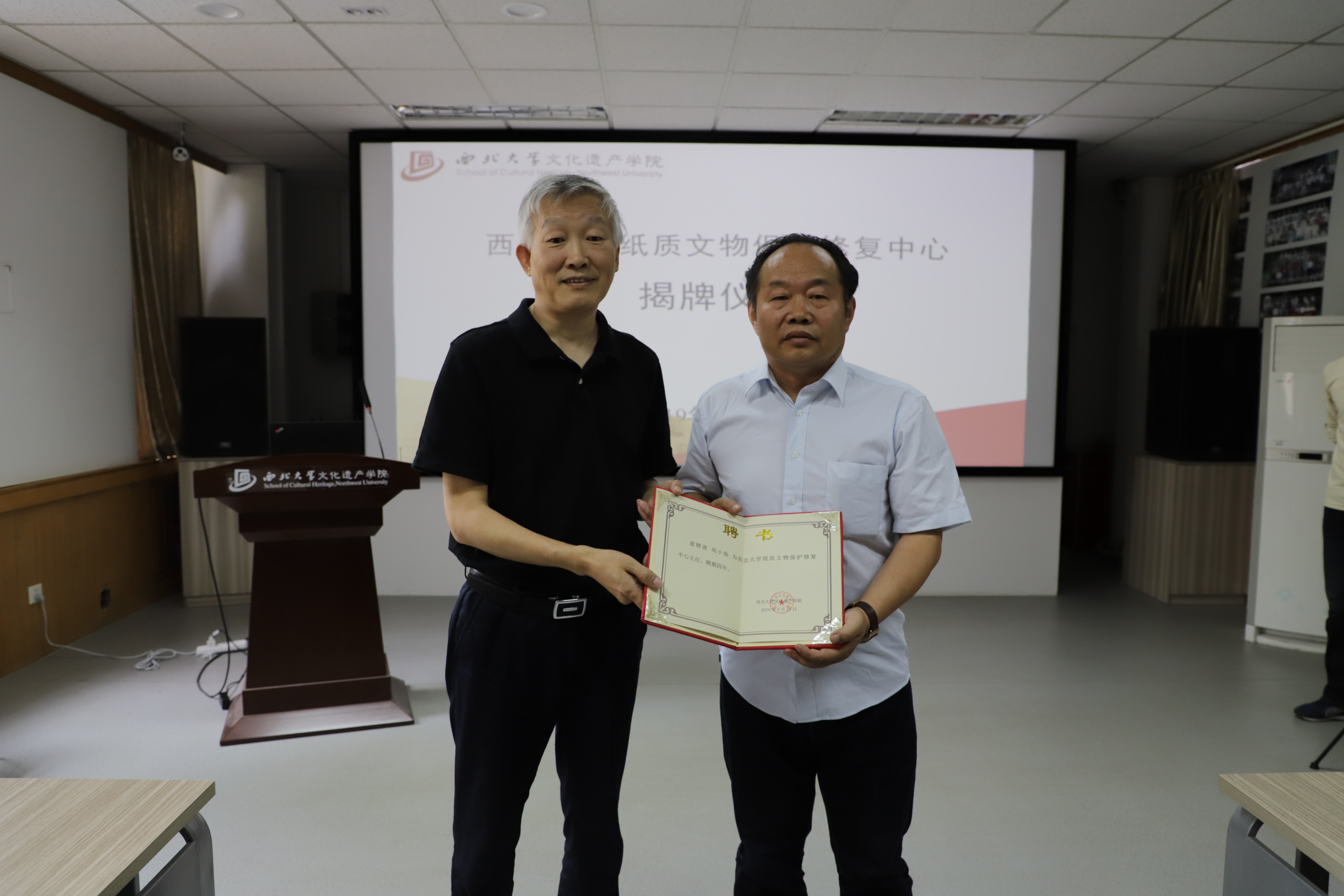 段清波经理和尚小临共同为文物保护修复中心揭牌,随后,段清波经理为中心主任尚小临颁发聘书。马健副经理为中心副主任田朋、杨璐颁发聘书。